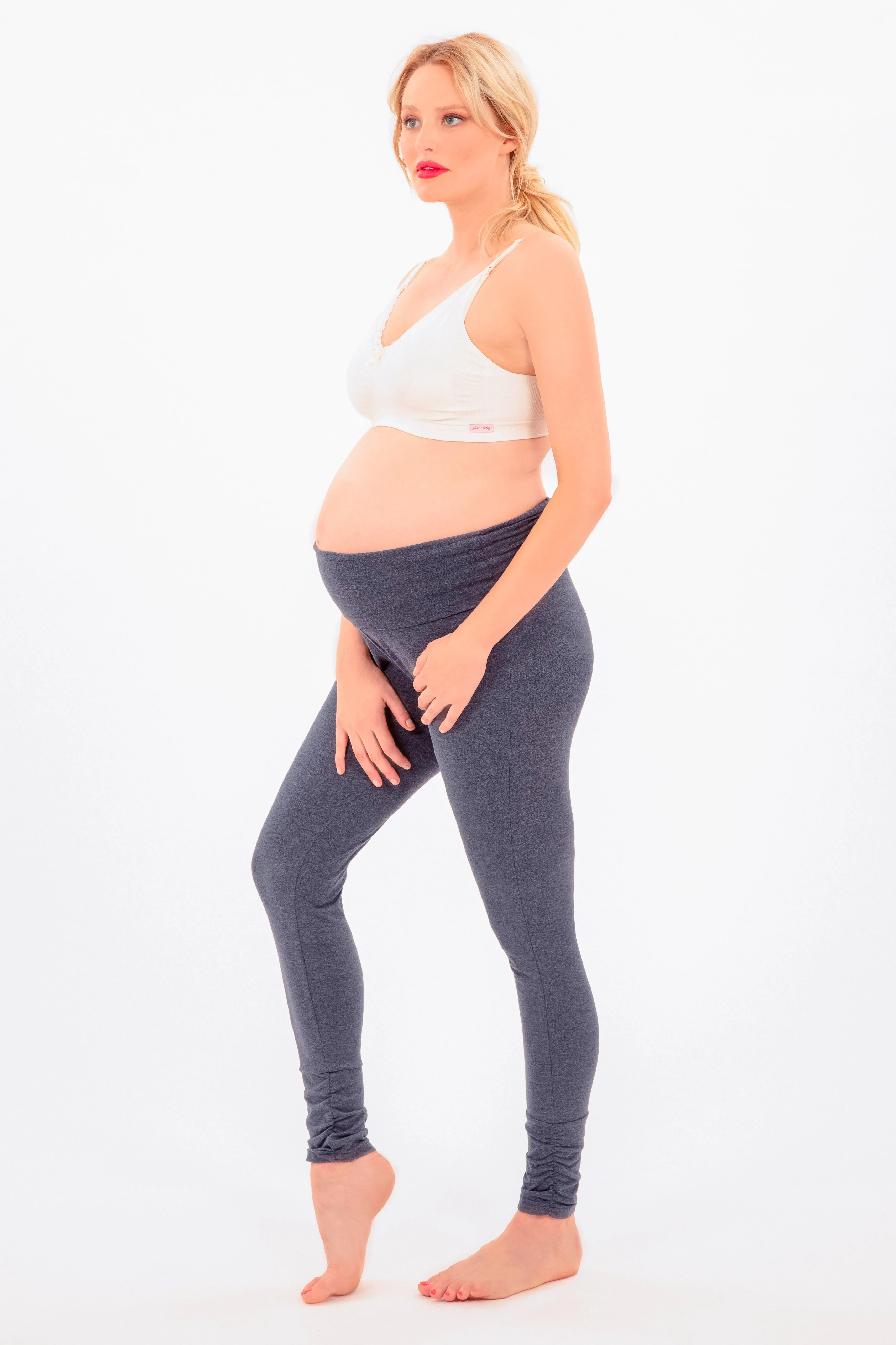 Lounge- und Pyjama Umstandsleggings mit weichem Bauchband und Raffungsdetails am Beinende. Der Bund kann sowohl über als auch unter dem Bauch getragen werden.