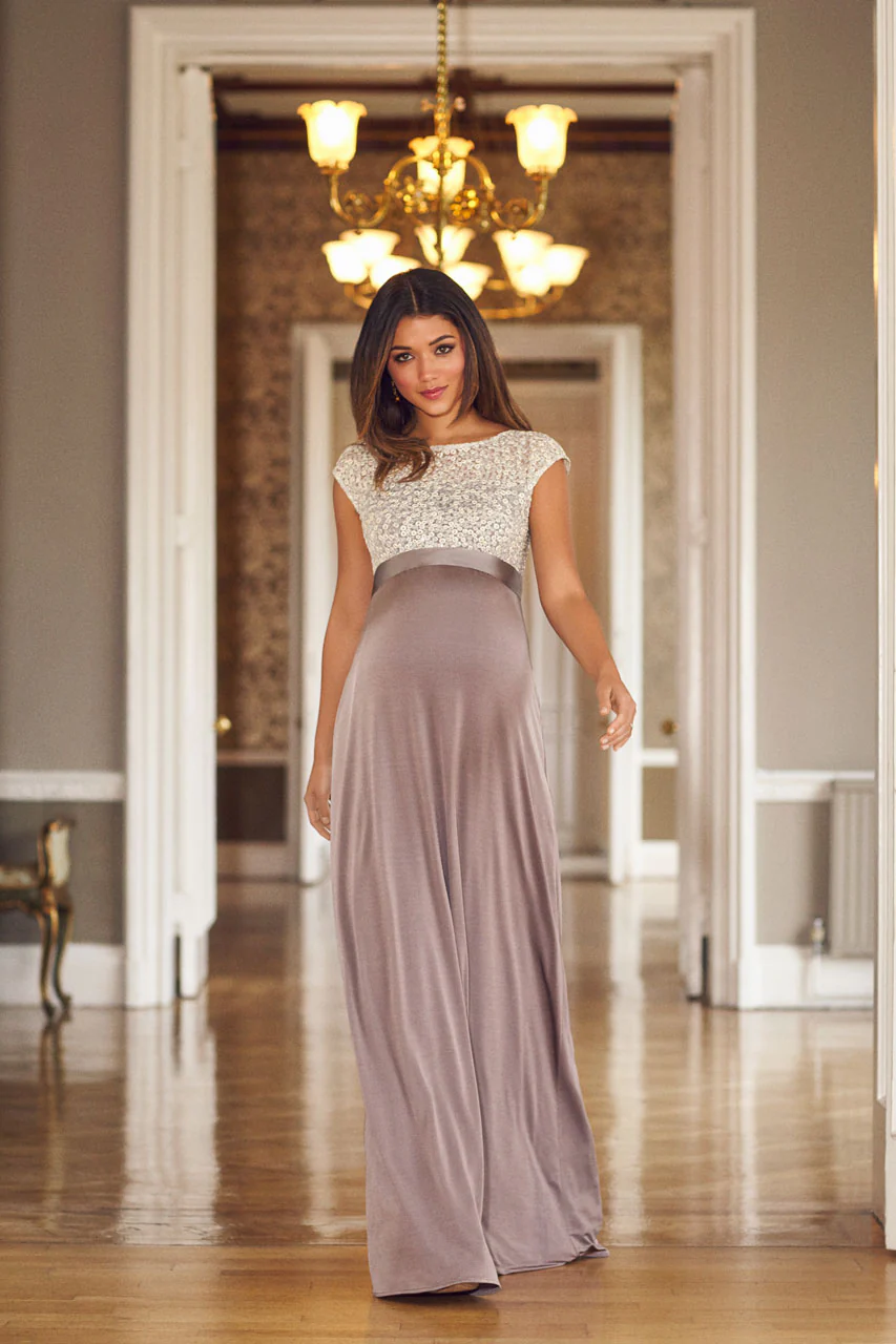 Bodenlange Umstandsrobe mit fein besticktem Bustier aus Pailletten und farblich abgesetztem Rock. Das Kleid hat außerdem leicht angeschnittene Ärmel und einen schmalen U-Boot-Ausschnitt. Das Kleid kommt ohne Schärpe
