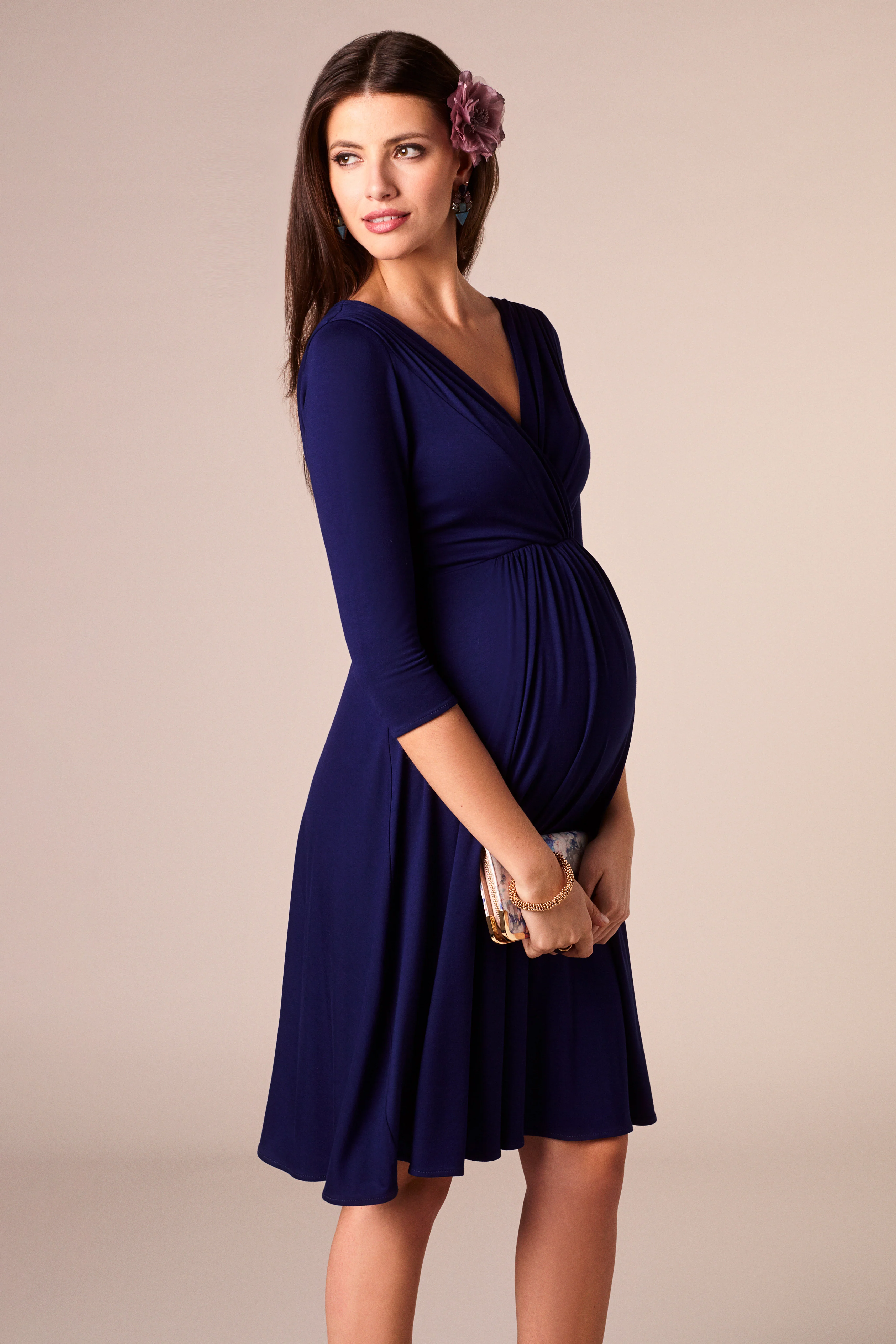 Knielanges Umstands-Kleid mit schwingend geschnittenem Rockteil, Cache-Coeur-Ausschnitt und V-Ausschnitt am Rücken. Durch den Cache-Coeur-Ausschnitt auch zum Stillen geeignet. Pflegehinweis: maschinenwaschbar bei 30°.