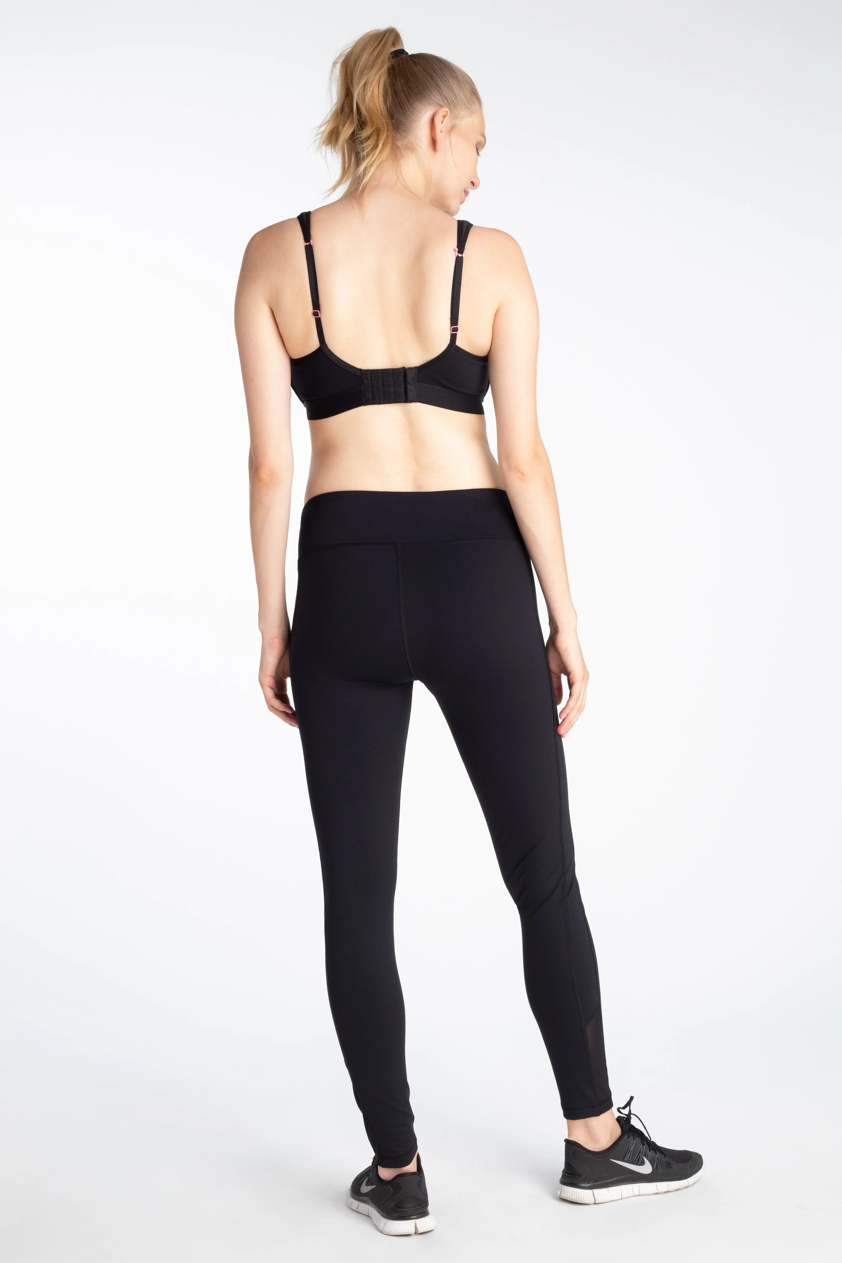 Unser Model Nele ist 179cm groß und auf den Fotos in der 33. SSW. Sie trägt die Leggings in Gr. S/M und dazu den Sport Mesh Umstands und Still BH in Gr. S.