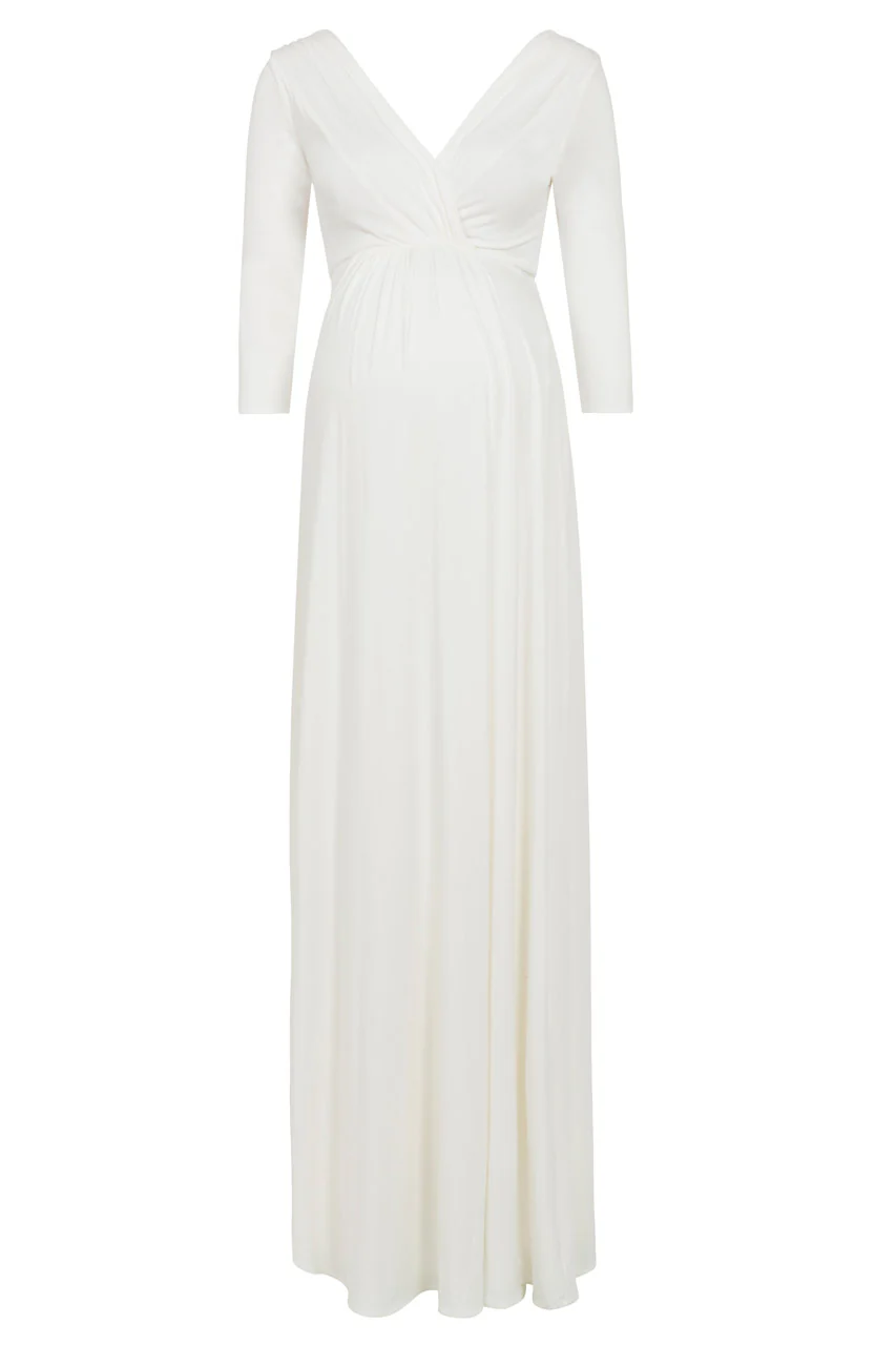 Elegantes, bodenlanges Umstandsbrautkleid mit 3/4-Ärmeln und A-Line Rock. Das Kleid ist durch den elastischen Cache-Coeur-Ausschnitt auch ideal zum Stillen geeignet. Das Kleid kommt ohne Schärpe.