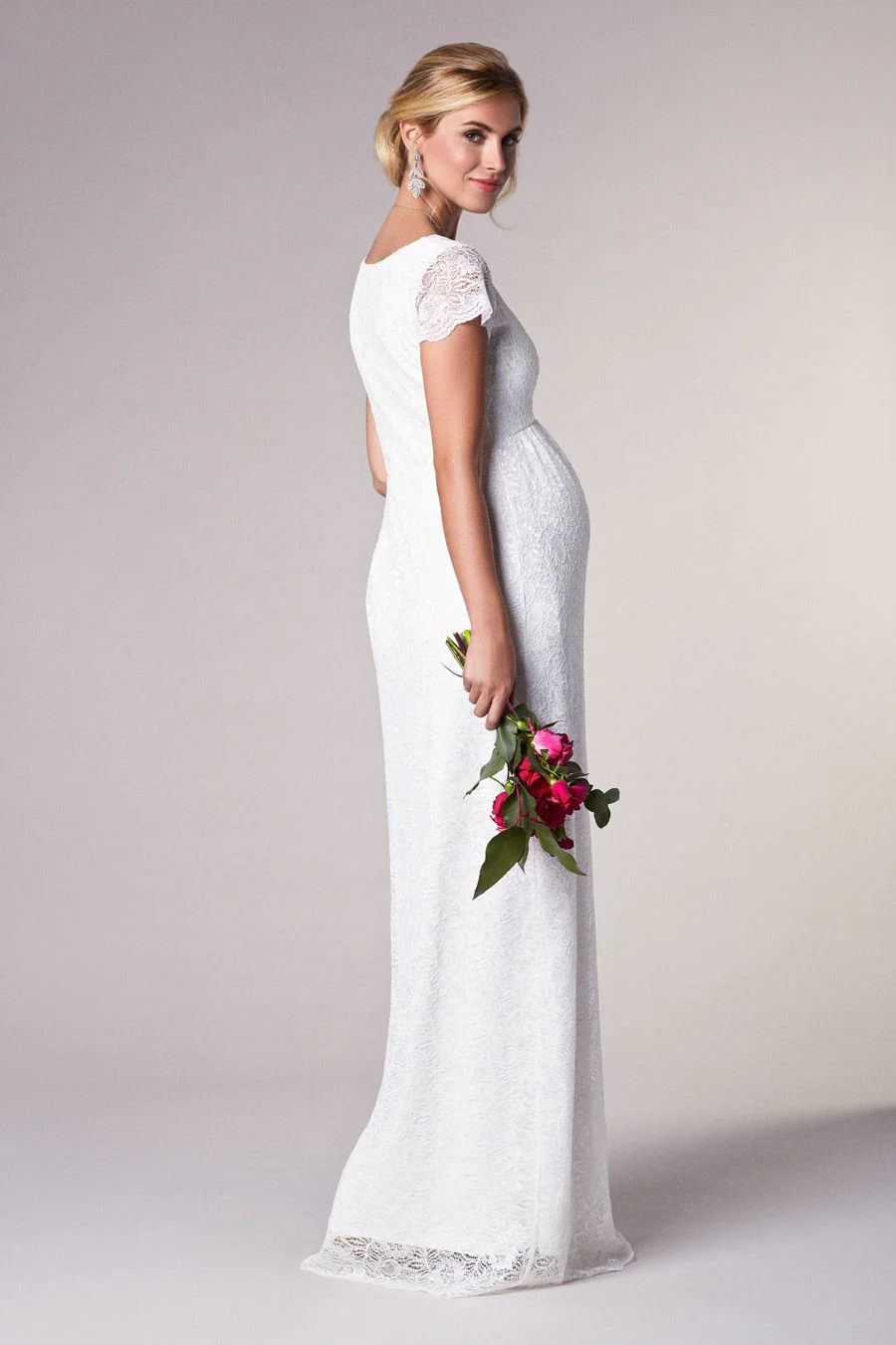 Bodenlanges Umstandsbrautkleid aus hochwertiger Spitze mit kurzen Ärmeln und betonter Empire-Linie. Das Unterkleid und die Spitze sind extra stretchig verarbeitet und sorgen für einen perfekten Sitz bei jeder Bauchgröße. Der V-Ausschnitt und die Ärmelenden sind mit wellenförmiger Spitze eingefasst. Das Kleid kommt ohne Schärpe.