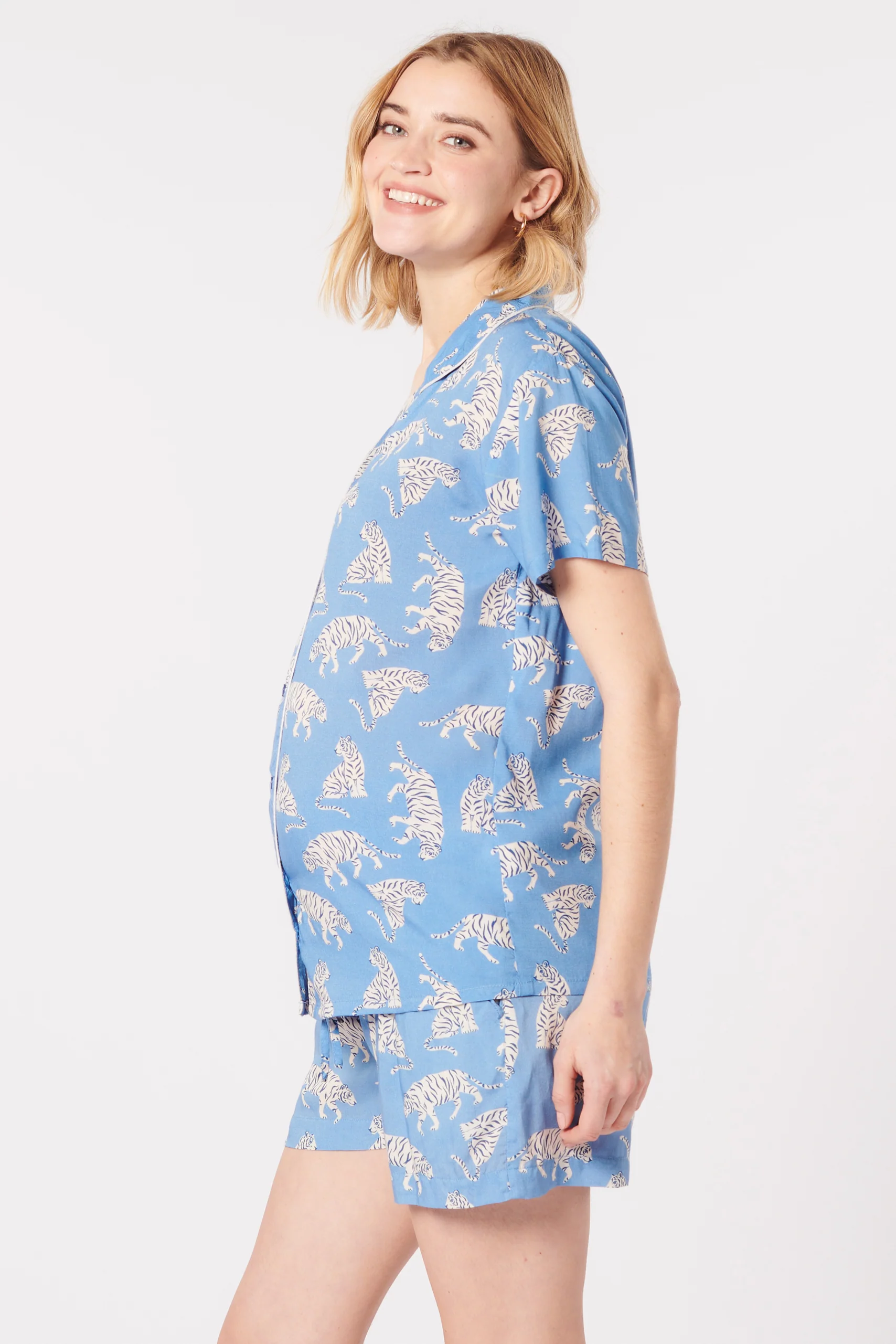 Kurzer Umstands- und Stillpyjama aus weichem Modal-Stoff mit Tiger Print und mit lässigem Revers-Kragen mit weißer Kontrastpaspel. Der breite, gesmokte Bund mit Bändel passt sich deinem Bauch während der gesamten Schwangerschaft problemlos an. Auch nach der Geburt wirst du das luftige Nachtwäsche-Set noch lange lieben. Die durchgehende Knopfleiste des Oberteils ermöglicht dir einen einfachen Stillzugang.