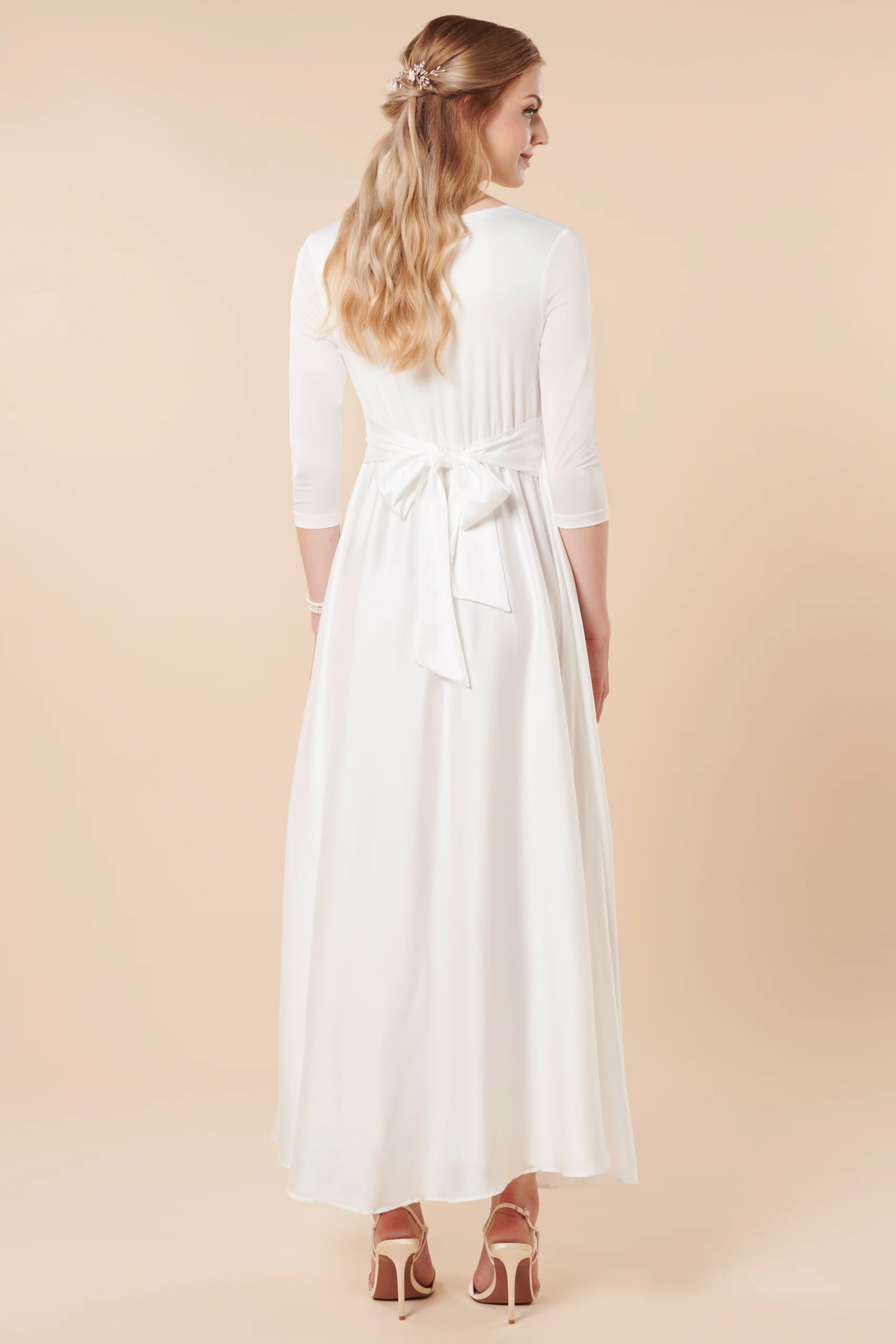 Umstandsbrautrobe mit schwingendem Satinrock und Cache Coeur Ausschnitt mit Stillöffnung. Der fließende Satinrock in weicher A-Linie sorgt für eine elegante Länge und passt sich flexibel deiner verändernden Silhouette an. Der Cache Coeur Ausschnitt zaubert ein wunderschönes Dekolleté und ist ideal zum Stillen geeignet. Die Schärpe kann sowohl vorne als auch hinten gebunden werden.